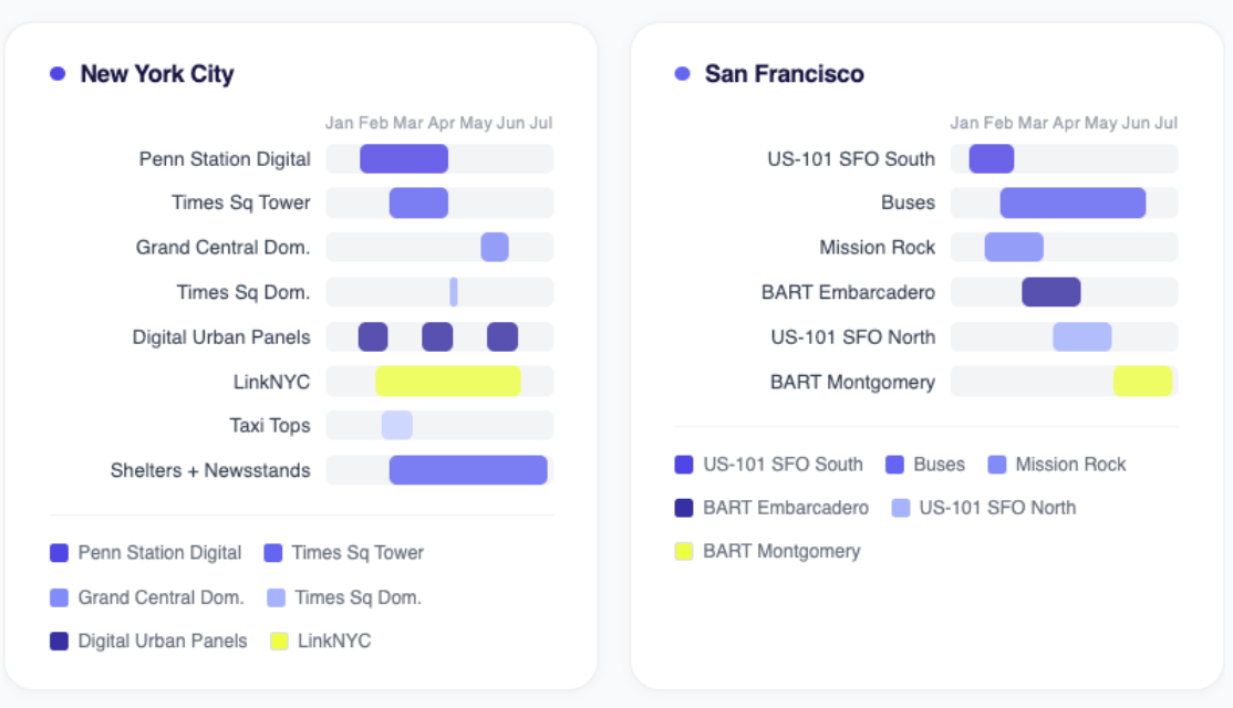 NYC was the primary market. We had Penn Station digital placement running February through late April, the Times Square tower static from March through April, taxi tops for four weeks in February, LinkNYC panels running February through July, static shelters and newsstands from March through July, and the two station dominations: Times Square the last week of April into May, Grand Central in late May through June.